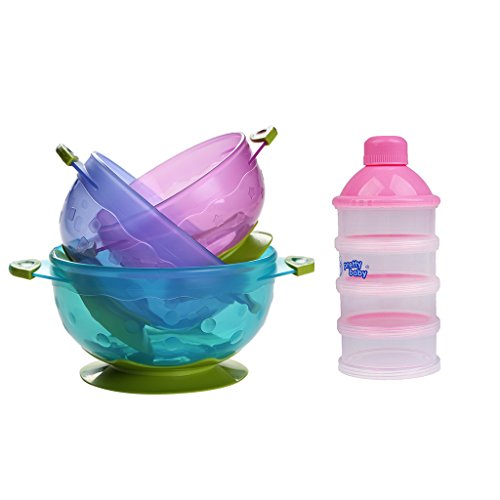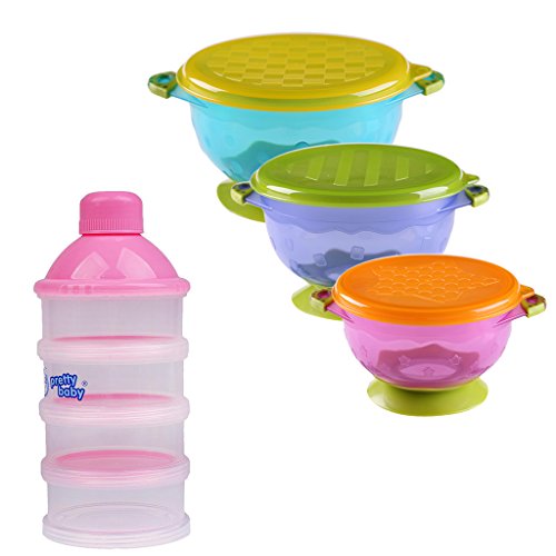 - 蓋付きの3つの異なる色とサイズの赤ちゃんボウルと、4層の流出防止スタッキング可能ミルクパウダーボックスがあります