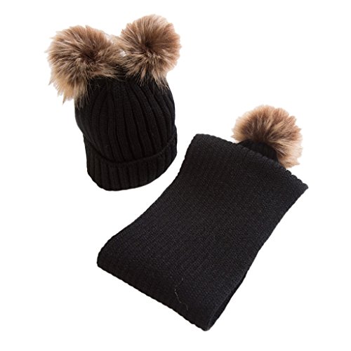 Lovoski ビーニー キャップ スカーフ セット ベビー 暖かい ポム ボブル スキー ハット ニット かぎ針編み 冬 全5色 - ブラック