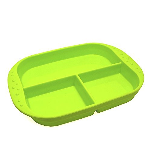 Size: 5" wide x 9" long x 1" tall. These portable, stackable silicone divided plates feature sturdy handles for easy transport and three individual compartments. The three sections help guide portion control and separate foods for those picky little eaters. They are perfect for home use or on-the-go. Like most Kinder Ville products, Little Bites Divided Plates are dishwasher and microwave safe and are a great alternative to plastic. They are bacteria resistant and, most importantly, BPA, phthalate and lead-free.