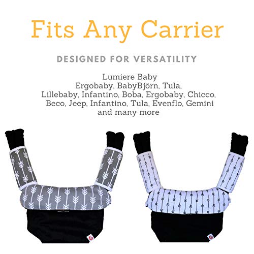 Tired of soggy, drool-covered baby accessories? Say hello to our Teething Drool Pad Set and enjoy a cleaner carrying experience!FITS ALL CARRIERSThe Lumiere Baby Teething Drool Pad Set is designed with busy parents in mind. Our versatile pad set functions with a variety of different baby carriers. From the Ergobaby 360 4 Position Carrier to brands like Lillebaby, Infantino, Tula and more, our pad set can be attached to virtually any carrier.SECURE ATTACHMENTUnlike other drool pads with button closures that move around with your infant or fall off when you take them out of the carrier, the Lumiere Baby pad is the only pad designed with secure buckle closures with adjustable straps for tightening and securing. You can easily take them off to wash when needed, but our pad won’t move about or fall off when your little one wiggles and squirms.KEEPS CARRIER CLEANAs parents ourselves, we know baby accessories are not easy to wash when needed. That is why we created our pads to cover and protect your expensive carriers, car seats and more from baby slobber and spit up. When life gets messy and your little one sucks, dribbles, drools or chews while they are growing or teething, the machine washable Lumiere Baby Teething Pads have you covered.SOFT AND GENTLEMade of 100% organic cotton with a soft fleece inner lining, the Lumiere Baby teether cover is so soft moms and dads will wish they had one too! The pads are extra thick to guard you and your items from drool, yet gentle on your infant’s baby teeth and tender gums.REVERSIBLEFeaturing a reversible, matching unisex design, our stylish teething pads come in a black/white or gray/white arrow pattern, making them perfect for boys or girls. New parents will also thank you for giving them as an adorable, practical present.Don’t wait, grab a Teething Pad for you and your friend today, and say goodbye to drooly messes and slobbery accessories!