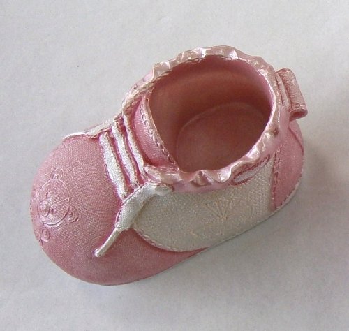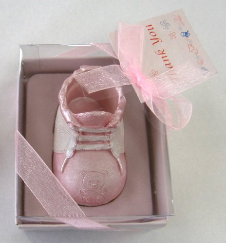 Baby Shoe With Thank You Card Favors - Pink, Set of 12;Baby shoe with baby themes imprint;Comes encased in an appealing gift box with clear plastic front and a satin ribbon bow;These favors are designed for gifting right out of the box and will leave an everlasting memory on your guests;Made of Poly Resin