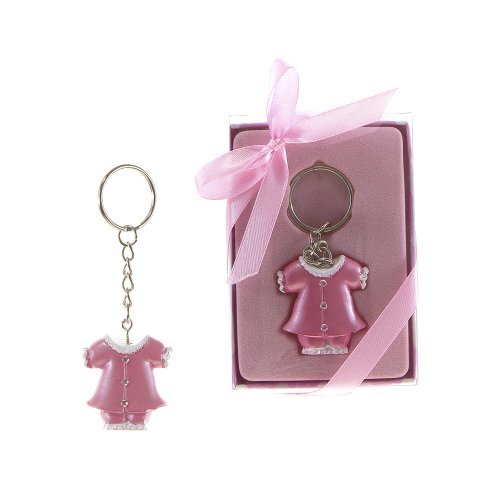 Baby Clothes with Crystal Key Chain Favors - Pink, Set of 12;Three crystals embedded in the middle of baby clothes;Comes encased in an appealing gift box with clear plastic front and a satin ribbon bow;These favors are designed for gifting right out of the box and will leave an everlasting memory on your guests;Made of Poly Resin