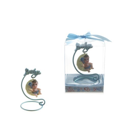 Baby Sitting on Swing Moon Favors - Blue, Set of 12;Baby sitting on a swing moon that is attached to a Baby phrase;Comes encased in an appealing gift box with clear plastic front and a satin ribbon bow;These favors are designed for gifting right out of the box and will leave an everlasting memory on your guests;Made of Poly Resin