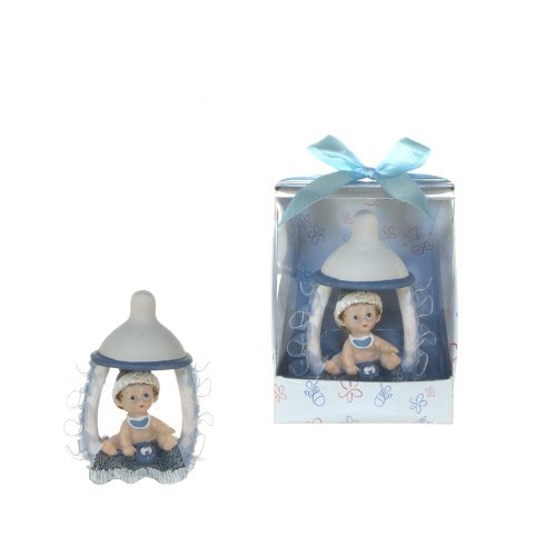 Baby Sitting Inside Pacifier Favors - Blue, Set of 12;Baby sitting inside a pacifier with lace decorations on the side;Comes encased in an appealing gift box with clear plastic front and a satin ribbon bow;These favors are designed for gifting right out of the box and will leave an everlasting memory on your guests;Made of Poly Resin