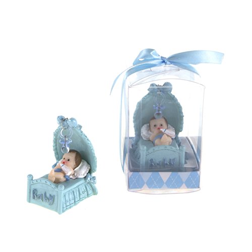 Baby Laying in Bassinet Under Pacifier Favors - Blue, Set of 12;Baby laying in bassinet under pacifier while holding a bottle;Comes encased in an appealing gift box with clear plastic front and a satin ribbon bow;These favors are designed for gifting right out of the box and will leave an everlasting memory on your guests;Made of Poly Resin