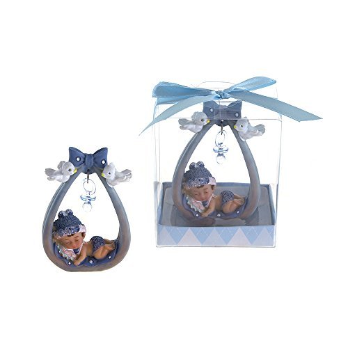 Baby Sleeping Under Pacifier Favors - Blue, Set of 12;Baby sleeping on a towel with a pacifier embellishment hanging above;Comes encased in an appealing gift box with clear plastic front and a satin ribbon bow;These favors are designed for gifting right out of the box and will leave an everlasting memory on your guests;Made of Poly Resin