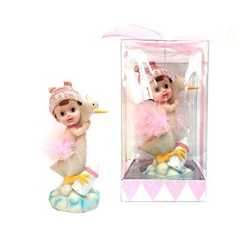 Baby Sitting on Stork Favors - Pink, Set of 12;Baby sitting on a stork which has feathers below;Comes encased in an appealing gift box with clear plastic front and a satin ribbon bow;These favors are designed for gifting right out of the box and will leave an everlasting memory on your guests;Made of Poly Resin