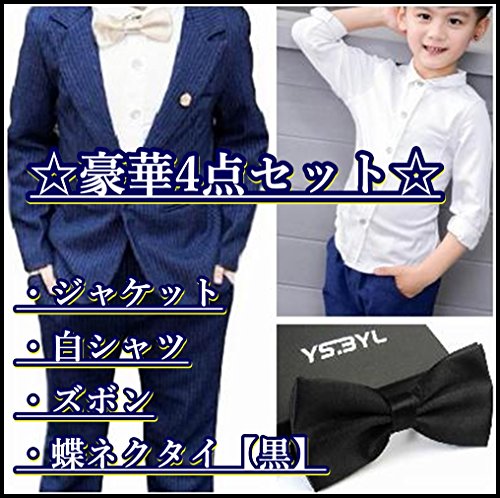 - ジャケット、スラックス、白シャツ、蝶ネクタイ【黒】の豪華4点セット☆これさえあればどんなシーンもお洒落にかっこよくきまるフォーマル セット♪ さり気ない個性を演出してくれるネイビーストライプ柄で待ちに待った晴れ舞台の主役に☆ 蝶ネクタイの色は使いやすいブラックです♪ サイズ調整可能!締め付け感なくお子様のお好みのサイズで◎ネクタイが苦手なお子様にも◎