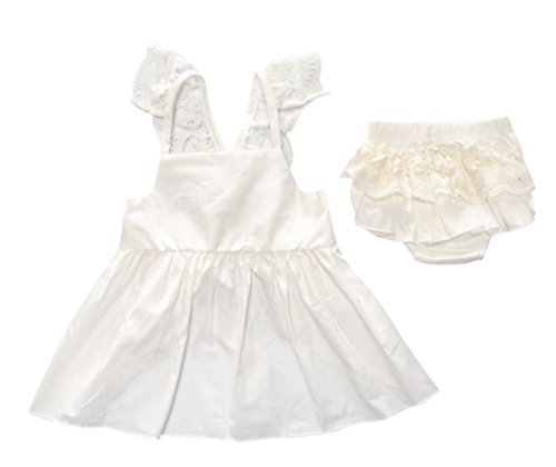 ◎ふわっと上品な広がりのあるシルエットは、心も体もプリンセス気分にしてくれます♪エプロン風のトップスの両肩には、ワンタッチ式のスナップボタンが付いているので後ろのリボンを結び直さなくても、パチっとボタンを付け外しするだけでお気替え&脱ぎ着が楽ちん!! 後ろのリボンで調整可能なので、大きくなってからもワンピースから、チュニック風として着れるので、永くお使い頂けるのも大きな魅力です。 - キャミソールT-シャツや、ロンティ、カットソーの重ね着をしたり、ボトムをデニムパンツや、レギンスをプラスしたり、トップスに、ボレロやカーデガンを羽織るだけで コーデの幅がグンと広がり春夏秋冬と活用できます。 またボトムのブルマパンツのウエストはゆったりゴムを使用していてデザインは刺繍の花柄レースを施しカジュアルすぎず上品な雰囲気があり清楚なきちんとコーディネートにも最適!