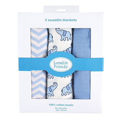 Luvable Friends 3 Piece Muslin Swaddle Blankets, Elephant, Boy