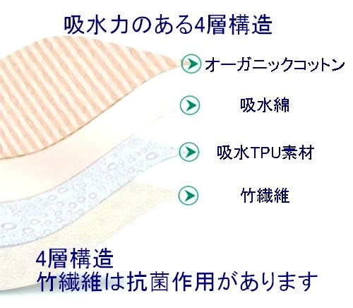 4層の生地の表面にオーガニックコットンを使用。吸水力を失わず、通気性も考慮しています。