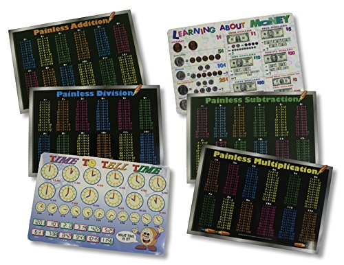 Painless学習Placemat Set for Kids :、減算、乗算、Division、お金と時間( Set of 6 wipe-offプレースマット)