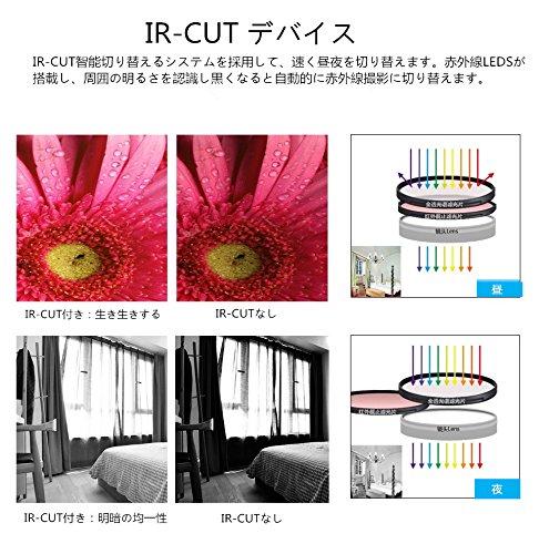 - 2、暗視撮影。IR-CUT智能切り替えるシステムを採用して、速く昼夜を切り替えます。赤外線LEDSが搭載し、周囲の明るさを認識し黒くなると自動的に赤外線撮影に切り替えます。夜間10 mの可視距離を達成できます、夜間の監視も行える防犯カメラです。
