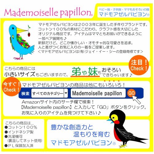 【Mademoiselle papillon(マドモアゼルパピヨン)】は2003年に誕生した職人による手作りブランド。コットン100%の素材にこだわり、クラフト感を大切にしたオリジナル商品です。アイテムはママともお揃いができるように一部ペア展開も。新鮮だけど、どこか懐かしい・オモチャ的な可愛さを追求。人と差が付くお気に入りの1着をご提案致します。<Mademoiselle papillonは(有)ジェイ・イー・シーの登録商標です。> 【お取り扱い時のアドバイス】(1)カタチの変化防止のため出来るだけ洗濯ネットに入れて洗濯して下さい。(2)刺繍などがあるものを洗濯ネットに入れるときは刺繍部分がネットに触れないように裏返してから入れて下さい。(裏地が付いている場合)(3)脱水は弱めで短時間に。(4)洗濯後は乾燥機など使わずにできるだけ陰干しをして下さい。(5)肌着類など肌に直接触れるものはできるだけ一度お洗濯してからのご使用をおすすめします。(6)ボタンやファスナーなどは閉じた状態でお洗濯して下さい。(7)その他、洗濯時のお取り扱い時には各商品の品質表示を参照して下さい。 【サイズの目安】100サイズ:3才前後~/110サイズ:4才前後~5才前後/120サイズ:6才前後~7才前後/130サイズ:8才前後~9才前後/*参考です。また、個人差もございますのでよくご確認下さいませ。