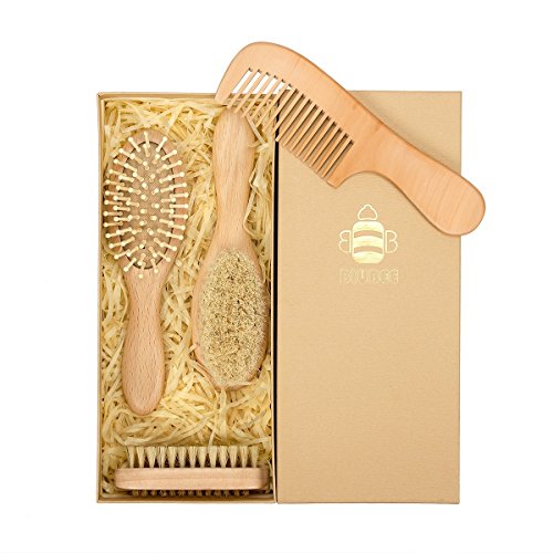 【4点櫛セット】 ベビー用 天然山羊毛ヘアブラシ 新生児 乳児 赤ちゃん用 頭皮マッサージ 静電気防止 出産祝ギフト/プレゼントに最適