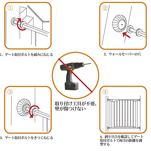 - 取付簡単:取り付け工具が必要なく、壁を傷つけないままにゲイトの取付ボルトをウォールセーバーの穴にはめ込むだけで完成します。
