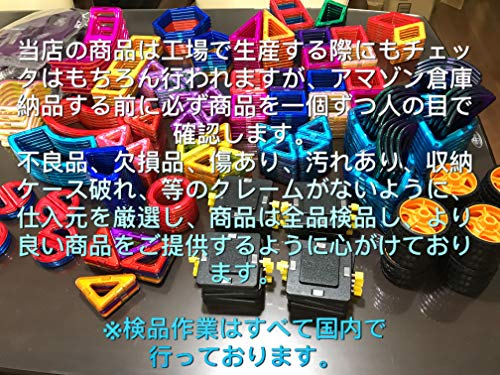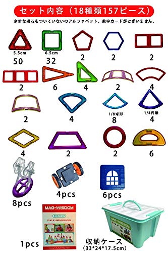セット内容(18種類157ピース) 余計な磁石をついていないのアルファベット、数字カードがございません。 三角形 ×50 四角形 ×32 五角形 ×2 六角形 ×2 2倍四角形 ×2 3倍四角形 ×2 二等辺三角形 ×6 直角三角形 ×4 ビッグアーチ ×2 中アーチ ×4 小アーチ ×2 扇形 ×4 1/8球形 ×8 1/4円錐 ×4 菱形 ×4 台形 ×2 円形 ×2 半円 ×6 窓 ×6ピース 観覧車パーツ ×8ピース 車輪 ×4ピース(車2台作れます) ガイドブック ×1ピース 収納ケース (33*24*17.5cm)