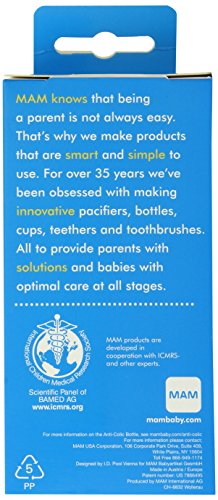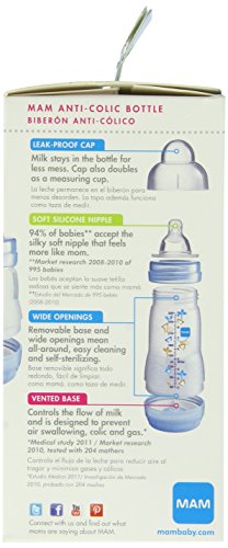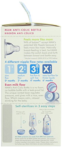 BPA- free, Can be sterilized in the microwave in just 3 minutes!;Wide openings and 5 parts make for easy cleaning;The MAM Ultra Soft Silicone Nipple makes for an easy switch between breastfeeding and bottle-feeding;Base ventilation systems provides a smooth milk flow which reduces air swallowed by baby, gas and burps;Comes with a slow flow nipple