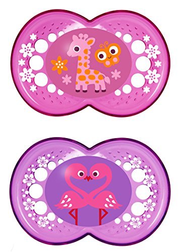 Two BPA-free pacifiers, Curved shield allows the pacifier to sit comfortably on baby's face, MAM Ultra Soft Silicone Nipple stays comfortably in baby's mouth due to the anti-slip texture, Symmetrical nipple ideal for baby's jaw development, Textured surface and multiple small openings on the pacifier shield allow air to circulate and baby's skin to breathe