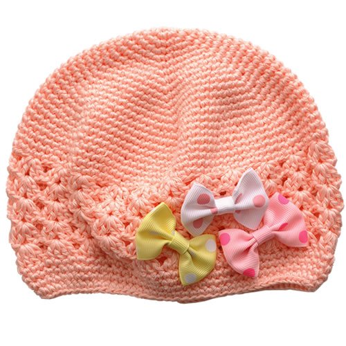 ・手触りの良いコットンにリボンが3個付いたクロシェットハット