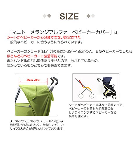 フットマフなどベビーカーの防寒グッズはたくさんありますが、顔や頭は出てしまい、冷たい風や空気にさらされていませんか?このマニトメランジアルファベビーカーカバーは雨だけじゃない、寒さや冷たい風、PM2.5や花粉などからも子供を守れる便利アイテムなんです。スーツなどに使用される最高級カチオン生地に防水加工を施した、とってもおしゃれなベビーカーカバー。レインカバーにありがちなビニール感は全くないのに防水機能もバッチリ!さらに視力保護窓を搭載し、カバーをしていてもカバーをしていないのと同じクリアな視界を実現♪カバーを外さなくても乗り降りできたり、お世話ができる大型開閉扉もあります。またベビーカーによってはカバーを外さずにベビーカーが畳める優れもの!ベビーカーによってはカバーを外さないと畳めませんのでご了承ください。サイズは2種類。ベビーカーによてサイズが異なりますので、サイズ表をご確認の上、ご注文ください。※また長時間雨に濡れる場合はジッパー部分から雨が染み込む可能性がございますので、事前に防水スプレーをされることをおすすめします。