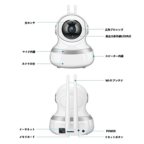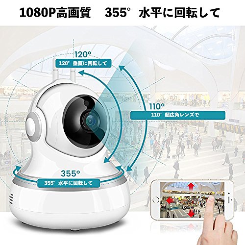 - 1080P高精細度ビデオの収録で、110°超広角レンズで、120°垂直に回転して、355°水平に回転して、部屋のどこでも監視られます。本製品は内蔵のスピーカーとマイクがあって、携帯のAppを通じて、 トークバックができて、交流することが非常に便利です!