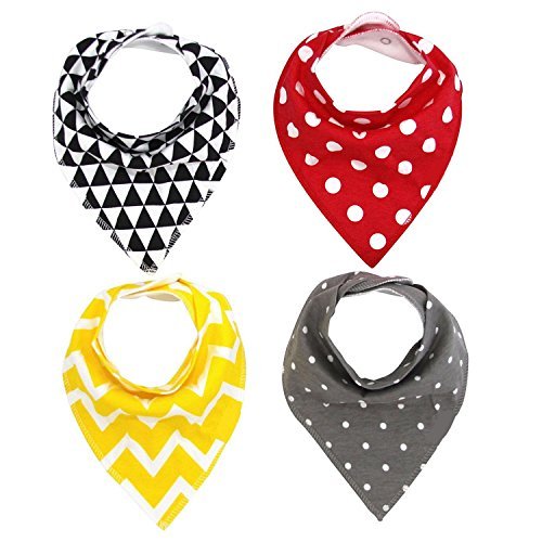 Bib is made with 100% organic cotton and is lined with polyester fleece on the back for maximum absorbency of spills;Pack of 4 Bandana Style Bibs with unisex printed designs.2 Adjustable snaps for growing babies between 0 and 24 months;The absorbent bandana bib is perfect for teething baby from keeping them dry longer.Stylish baby bandana bibs can make your baby drool cool and accessorize your little ones' outfits.;Measurement-33cm*34cm/12.99*13.39. For newborns with sizes for one to twenty-four months old;Package includes 4 * bandana drool bibs