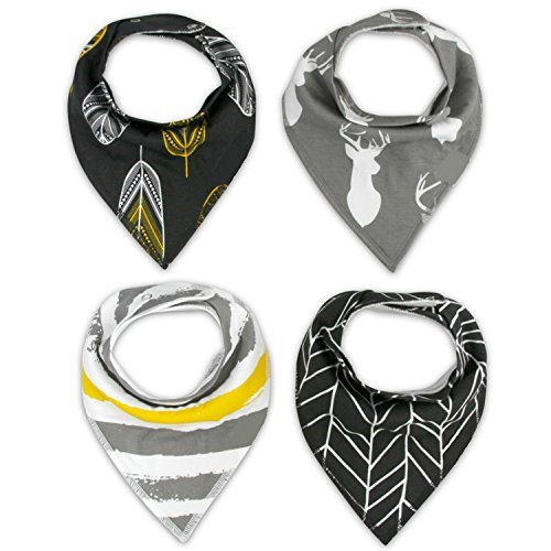 Bib is made with 100% organic cotton and is lined with polyester fleece on the back for maximum absorbency of spills;Pack of 4 Bandana Style Bibs with unisex printed designs.2 Adjustable snaps for growing babies between 0 and 24 months;The absorbent bandana bib is perfect for teething baby from keeping them dry longer.Stylish baby bandana bibs can make your baby drool cool and accessorize your little ones' outfits.;Measurement-33cm*34cm/12.99*13.39. For newborns with sizes for one to twenty-four months old;Package includes 4 * bandana drool bibs