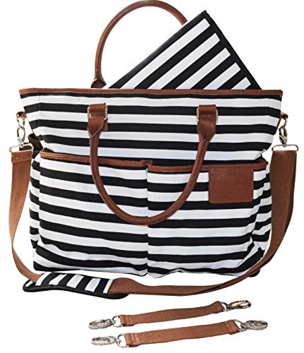 BEST DESIGN FOR STYLISH MOMS EVER - Stylish, beautiful, perfect size, wonderful design and details!;13 BEST DESIGNED POCKETS -Two large front pockets provide moms easy access to more frequently needed items. One large back pocket is for mom to carry IPAD, books, cellphone and keys. Two side pockets are insulated and designed to hold your baby's bottles and sippy cups. Six pockets inside the bag are for diapers, wipes, bibs, clothes, sanitizer, tissues, and sunscreen cream etc. There is a zippered compartment to protect mom's personal items including wallets.;SUPER PRACTICAL REMOVABLE STRAPS /ITEMS - This diaper bag has beautiful handles so you can carry it by hands or your arm. It also comes with removable shoulder straps that turns this bag into a crossbody/shoulder tote bag with no time. You can also remove shoulder straps and attach two smaller removable stroller straps to the bag as well as your stroller. It will turn this bag into the most beautiful stroller organizer. The bag comes with a matching baby changing pad as well.;PREMIUM MATERIAL HIGH QUALITY STITCHING - This stylish diaper bag is made of beautiful, durable, premium cotton canvas with great quality stitching and binded edges. Handles and bottom of the bag are made of stylish PU leather for added beauty and easy cleaning.;MULTIPLE BEAUTIFUL COLOR OPTIONS AND BAG SIZE- Multi-color options are available - choose among black/white striped, brown/white striped, grey/white striped and red/white striped to match your favorite outfit! Bag size is 43*34*13 cm (16.9 *13.4*5.1 in).