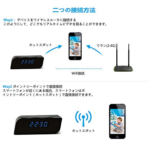 - 【接続方法】二つ接続方法があります。1.デバイスをワイヤレスルータに接続(どこでもリアルタイムビデオを見ることができます)。2.ポイントツーポイントで直接接続(スマートフォンが近くにある場合)ご注意:こちらのネットワークカメラは2.4G Wi-Fiのみをサポートしています