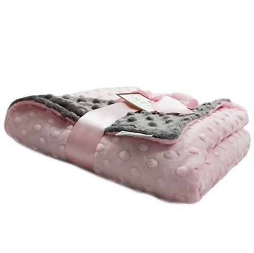 This beautiful double sided pink & charcoal minky dot blanket is sure to be mom & baby's favorite!;At a measurement of 30 x 30 this baby blanket is perfect for snuggling into car seats and strollers.;Your purchase will arrive tastefully wrapped in tissue paper & tied with ribbon-- Just as much fun to give as to receive!;Machine wash/ Tumble Dry.;Proudly made in the USA.