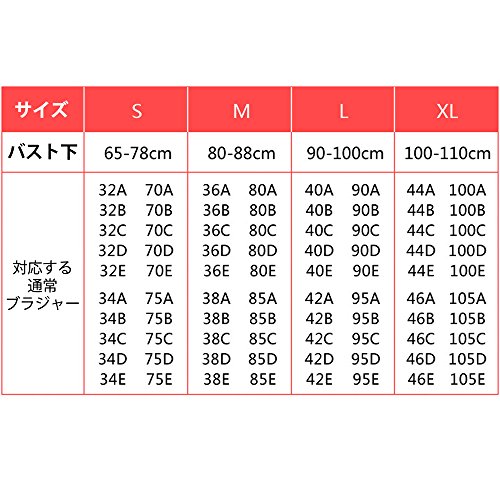 - サイズ:S-XL S:70/32A〜75/34Eの方用 アンダーバスト65−78cm M:80/36A〜85/38Eの方用 アンダーバスト80−88cm L:90/40A〜95/42Eの方用 アンダーバスト90−100cm L:100/44A〜105/46Eの方用 アンダーバスト100−110cm