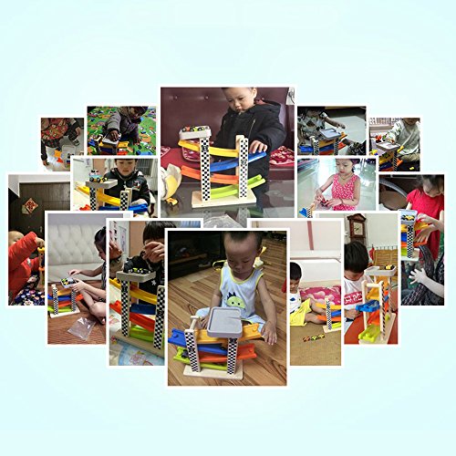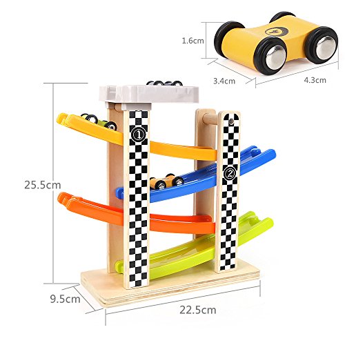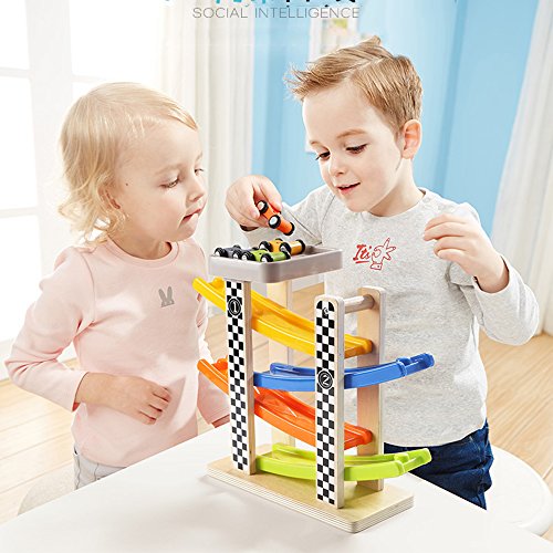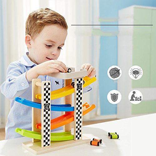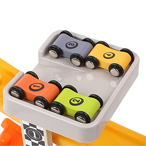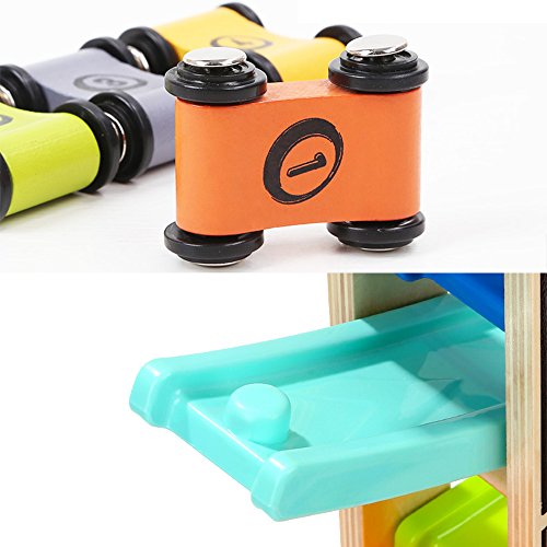 - 【ヨーロッパデザインの木製玩具】カラフルで巧みなデザインは楽しい気分を盛り上げてくれちゃう♪ 耐久性優れ、丈夫でしっかりとした造り、製品の角はすべて丸くなっており安全にも配慮しています。車4台付属、パパママや友達と車を競走することもできます。お友達を呼んで思いっきり楽しもう!!