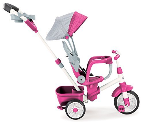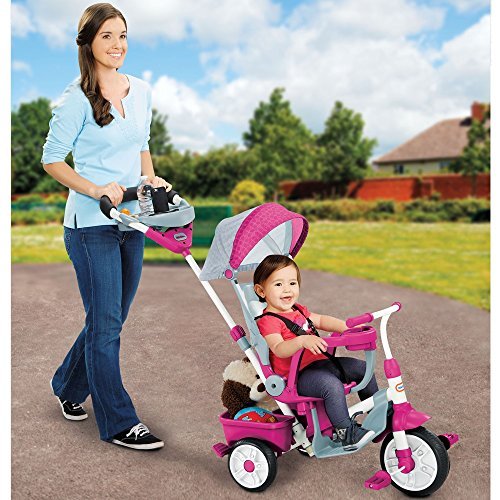 The Perfect Fit 4-in-1 Trike is ready to grow with your child! With all of the features of your favorite stroller, this trike is not only a perfect fit for your child ? it's a "perfect fit" for parents too! This advanced trike makes on-the-go travel easy with multiple storage spots! From parents pushing, to toddlers learning to pedal, to them starting to steer, and then going on their own, this trike keeps pace with your active, growing child. Stage 1-Stroll (9+ months) Parents to push and control-When the foot platform is installed, the child will be unable to reach the pedals Stage 2-Pedal (18+ months) Toddlers can learn how to pedal, child is unable to turn the wheel Stage 3-Learn (24+ months) Remove the waist bar, child can steer while parent still has control with the push bar Stage 4-Trike (30+ months) Remove the push bar to let kids go on their own with parent supervision Product Features: ? Pink 4-in-1 trike to grow with your child from stroller to trike ? Full shade canopy to protect child from all angles ? High-back seat for comfort and safety ? Adjustable seat with the flip of a switch ? Full foot platform fully protects little feet ? Large parent storage bucket and bottle holder ? Safety-bar with cup/snack holder ? Ages: 9+ months