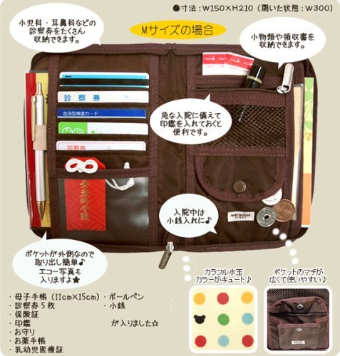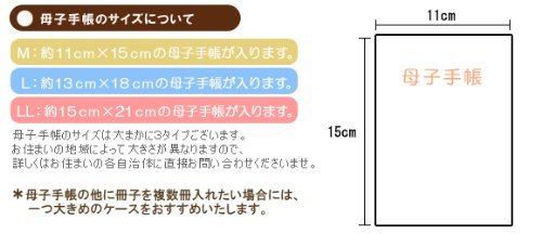 - 母子手帳は約15×21cmの大きさまで入ります。(手帳の厚みなどによりサイズが合わなくなってしまう場合もございますので、余裕をもったサイズケースでのご利用をおすすめいたします。)