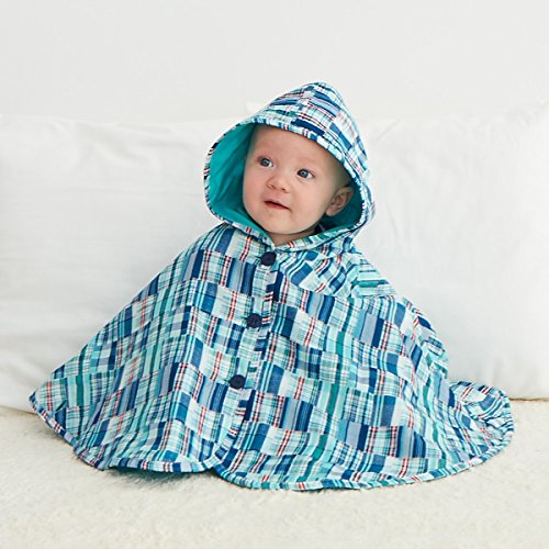 胸元ワンポイント刺繍がついた無地の面と、片面がチェックとお花柄のリバーシブルポンチョです。