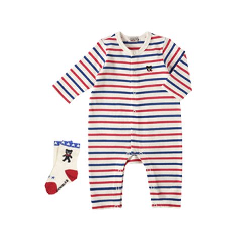 ダブルB(mikihouse) Everyday Double_B ボーダーカバーオール&ソックスセット 70cm 赤×紺(42)