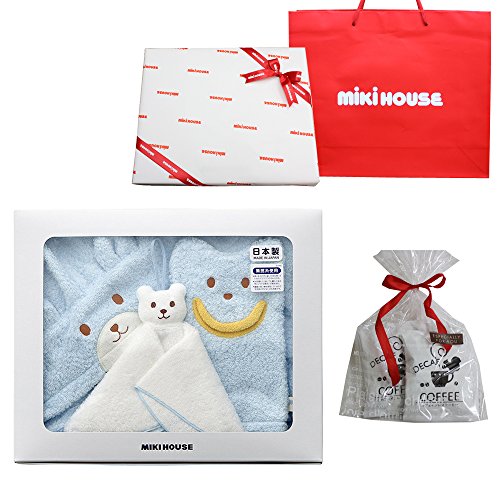 ミキハウス ベビーバスポンチョ 出産お祝セット ブルー(リボンラッピング包装済み)+オリジナルデカフェセット