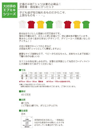 寸法 (cm) 70 80 90 100 110 120 130 140 150 身幅 27 28 29 31 32 34 36 37 40 着丈 33 36 39 41 45 48 50 53 58 ※表示寸法は目安となっております。 実際の商品の寸法とは若干差がある 場合がございます。ご了承くださいませ。 大好評のエブミキシリーズ☆ 定番の半袖Tシャツは夏の必需品! 通園着・普段着にぴったり♪ 子ども達が毎日触れるものだからこそ、 上質なものを・・・。 素材はさらりとした肌触りの天竺素材です。 薄手の平編み地で、さらっと軽い肌触りで、 特に通気性が優れています。 着まわしのきく飽きの来ないデザインで、 デイリーユーズ間違いなしのアイテム!! お泊り保育やキャンプのときなど お着替え用Tシャツとしても重宝しますよ☆ 豊富なサイズ展開なので、ベビーからお兄ちゃん、 お姉ちゃんまでお揃いで着れるのも嬉しい☆ カラフルな色を楽しみながら、 定番のお洋服として毎日のコーディネイトに 大活躍させてあげてくださいね!