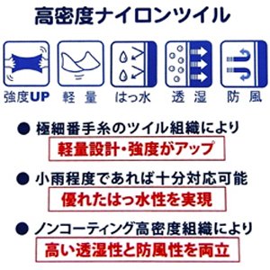 表面の素材は高密度ナイロンツイルで、高い透湿性と防風性を兼ね備えています。