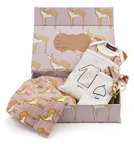 Gift Set includes: Swaddle Blanket, Gown, and Hat;Elastic bottom gown with knotted hat.;Organic muslin swaddle blanket.;Made of 100% GOTS Certified Organic Cotton;Packaged in a gift box.