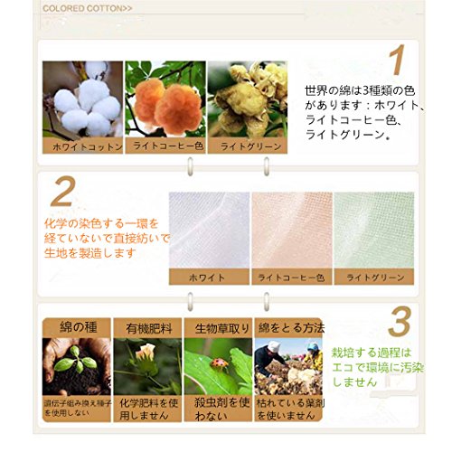 使用しているオーガニックコットン生地は全く漂白・染色を施していない自然のままの色の為、原料(綿)のロットによって生地の色合いにバラつきがあり、ロット変わり時には同一商品でも若干、色合いが異なる場合があります。
