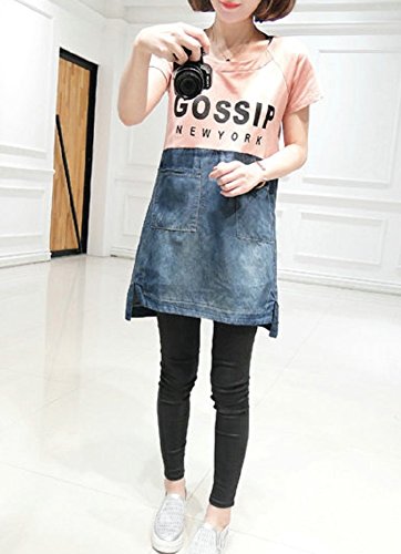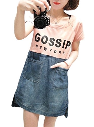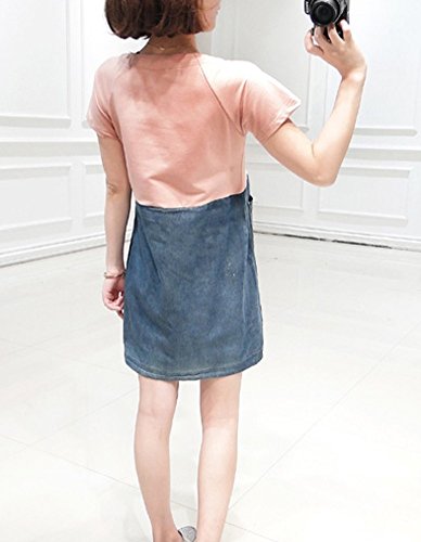 【MINI MAM】 デニム カジュアル バイカラー ワンピース 妊婦 妊娠中 授乳服 ママ レディース M L 黒 灰色 桃色 夏 半袖 スカート (L, ピンク)