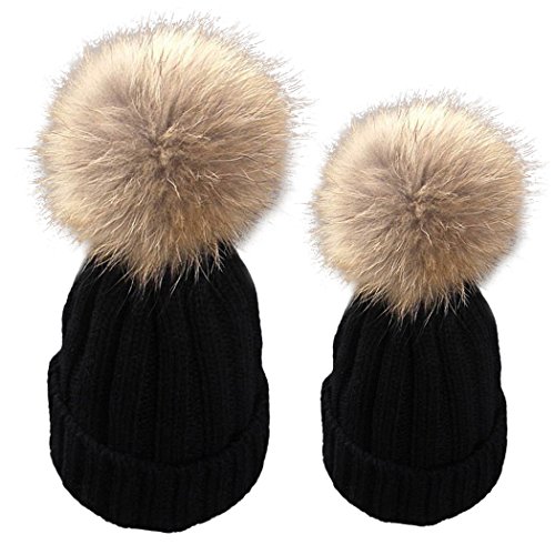 MIOIM® ニット帽子 親子 大人と子供 帽子 2点セット 無地 カジュアル ポンポン フリーサイズ 5色 多色選択 厚手 保温防寒