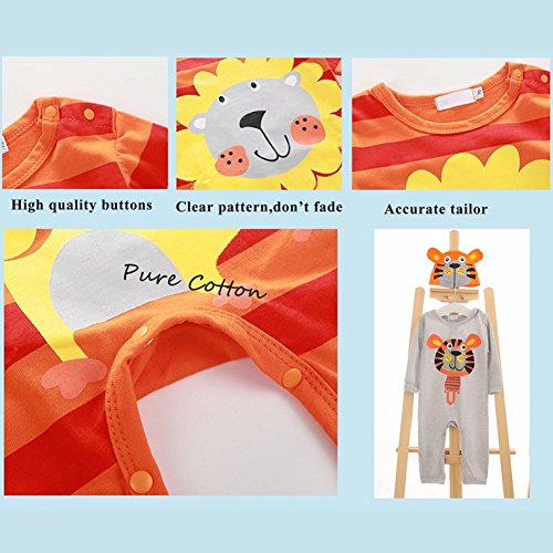 MIOIM ベビー服 可愛い 動物 プリント ロンパース 男の子 女の子 長袖 帽子付き セットアップ 出産祝い 連体服 ボディスーツ 肌着 0-24ヶ月 (ライオン柄, 90CM)