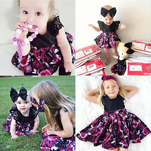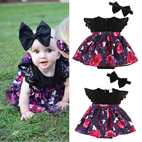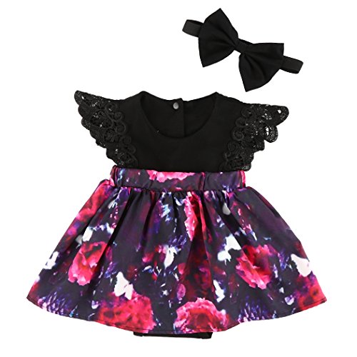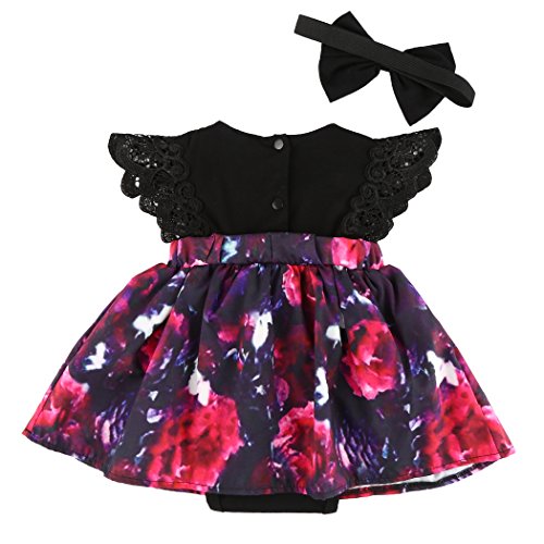 MIOIM 可愛い キッズ 姉妹 ドレス ベビー服 女の子 飛び袖 花柄 プリント ロンパース ワンピース ヘッドバンド付き ブラック