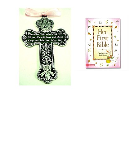 Lovely Gift Set for BABY GIRL;HER First BIBLE - a collection of Little Stories for Little Hearts. It contains a short synopsis of 19 Old Testament stories and 22 New Testament stories. This lightly padded hardcover book is 4? by 6;Also includes lovely PEWTER Crib Cross with pink ribon for hanging. Cross Reads Bless the child who lives here. Fill her life with love and cheer. Keep her safe, year after year. Engraved on the back of the cross is - God's Love Is With You Always.;Cross measures approx 4. This is great gift for a newborn;Perfect for Christening/Baptism