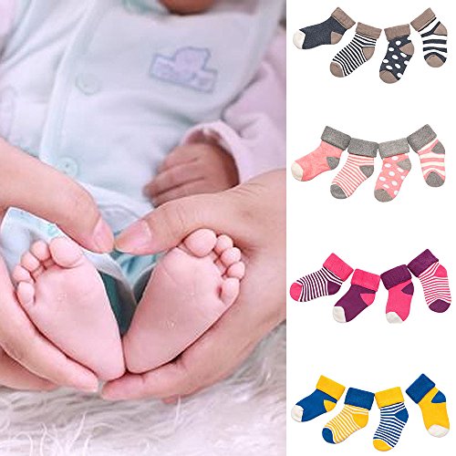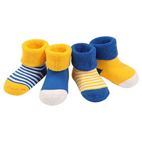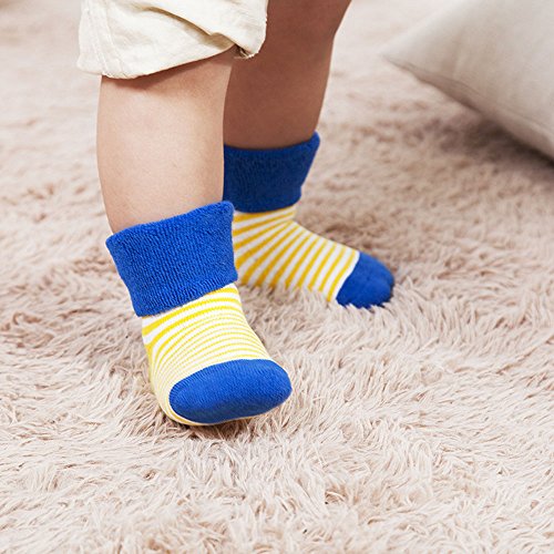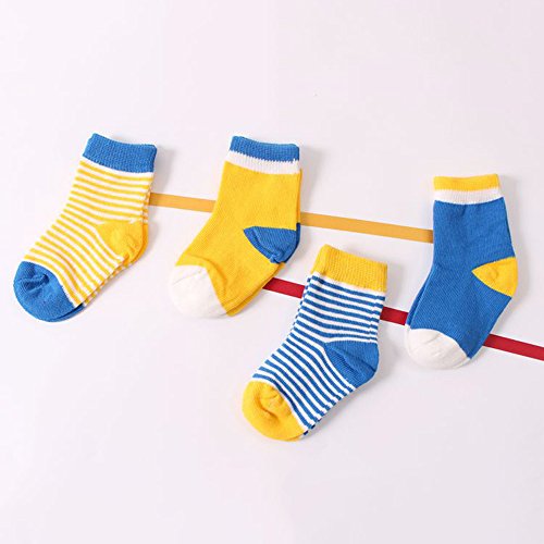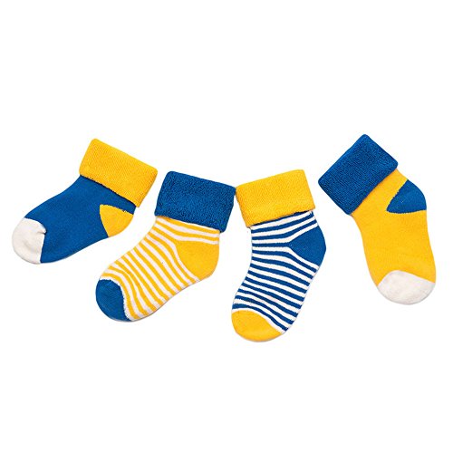 4ペア 赤ちゃん着 冬着靴下 ウォーマー 暖かい 厚い テリーコットンストライプドットソックス 黄色い+ブルー sサイズ