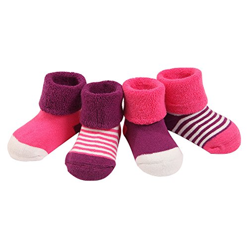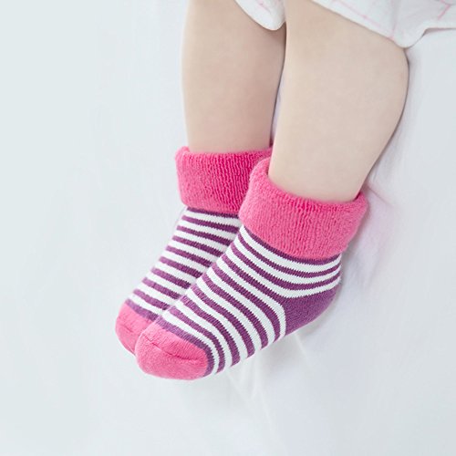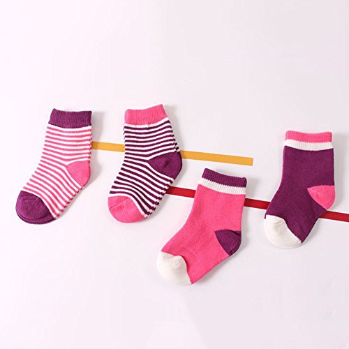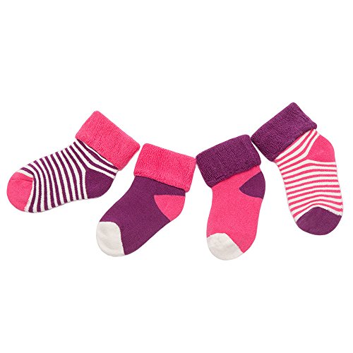 4ペア 赤ちゃん着 冬着靴下 ウォーマー 暖かい 厚い テリーコットンストライプドットソックス ピンク+紫 xsサイズ