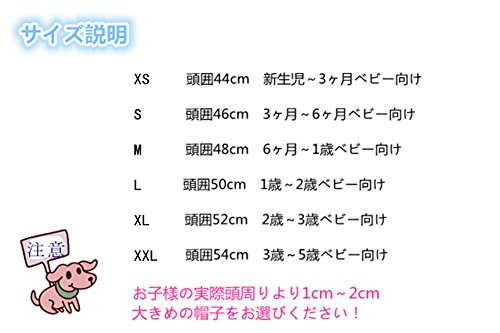 - サイズ選択:XS(頭囲44cm、新生~3ヶ月)、S(頭囲46cm、3ヶ月~6ヶ月)、M(頭囲48cm、6ヶ月~12ヶ月)、L(頭囲50cm、1歳~2歳)、XL(頭囲52cm、2歳~3歳)、XXL(頭囲54cm、3歳~5歳)